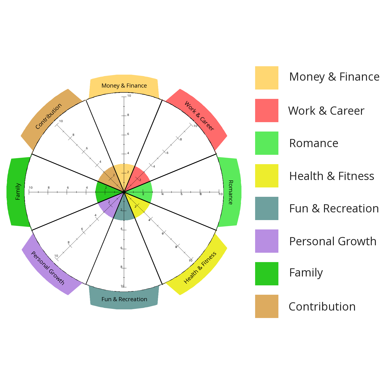 The Wheel of Life is a simple but powerful tool that helps you visualize all the important areas of your life at once. It is often used by life coaches and career coaches to give their clients a "bird's eye" view of their lives. By looking at a visual representation of all the areas of your life at once, the wheel helps you to better understand which of your life areas are flourishing and which ones need the most work.